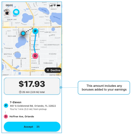 Bonuses are additional dollars added to your base pay and tips. When you qualify for a bonus, the total earnings (base pay + tips + bonus) will be shown on the offer card, giving you a single view of your earning potential for that delivery.